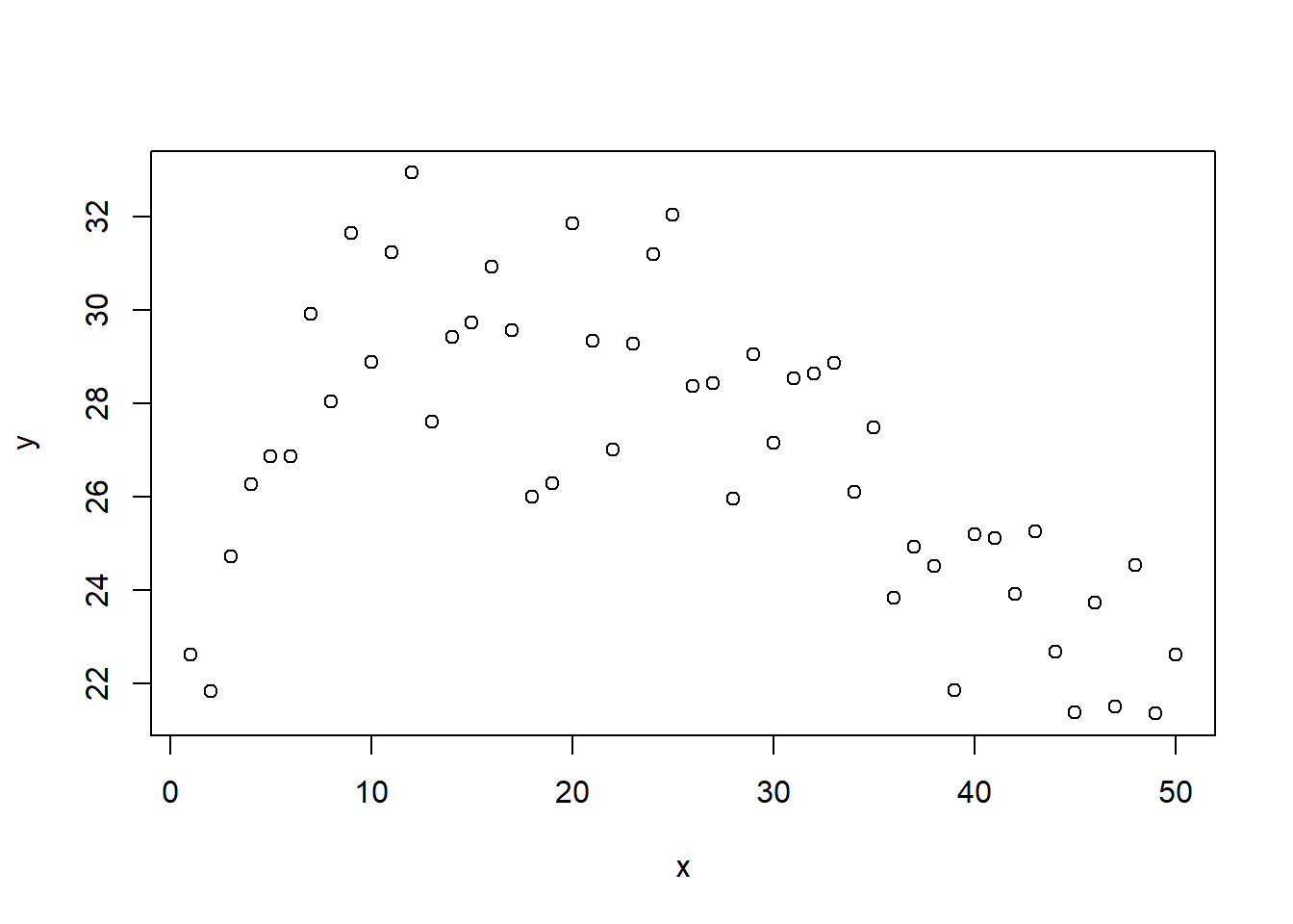 y <- 15 + 15*sin(sqrt(x*.15 - x*.006))+ rnorm(length(x), 0, 1.5)