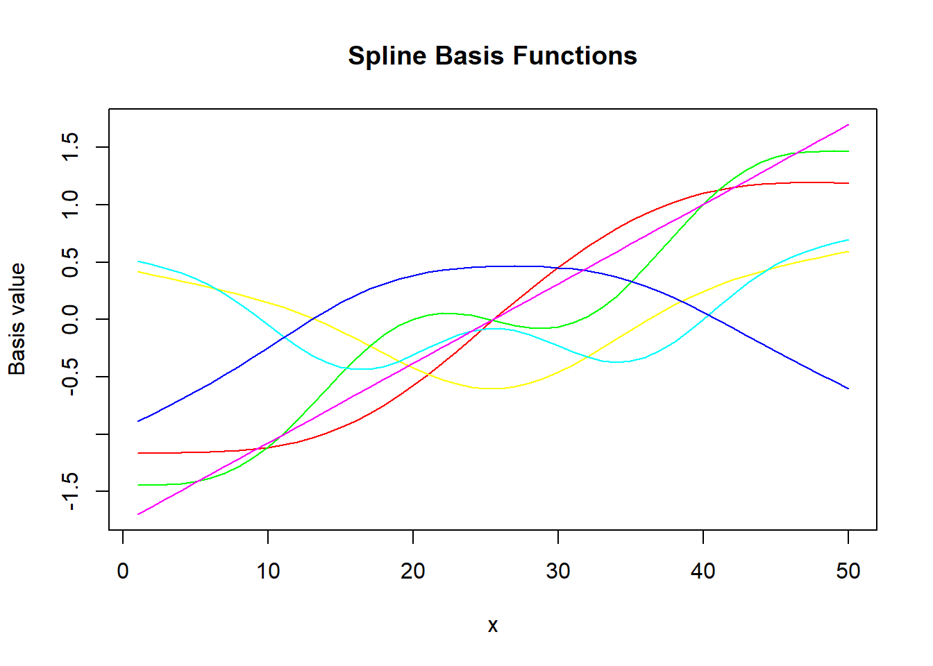 main = "Spline Basis Functions", xlab = "x", ylab = "Basis value")