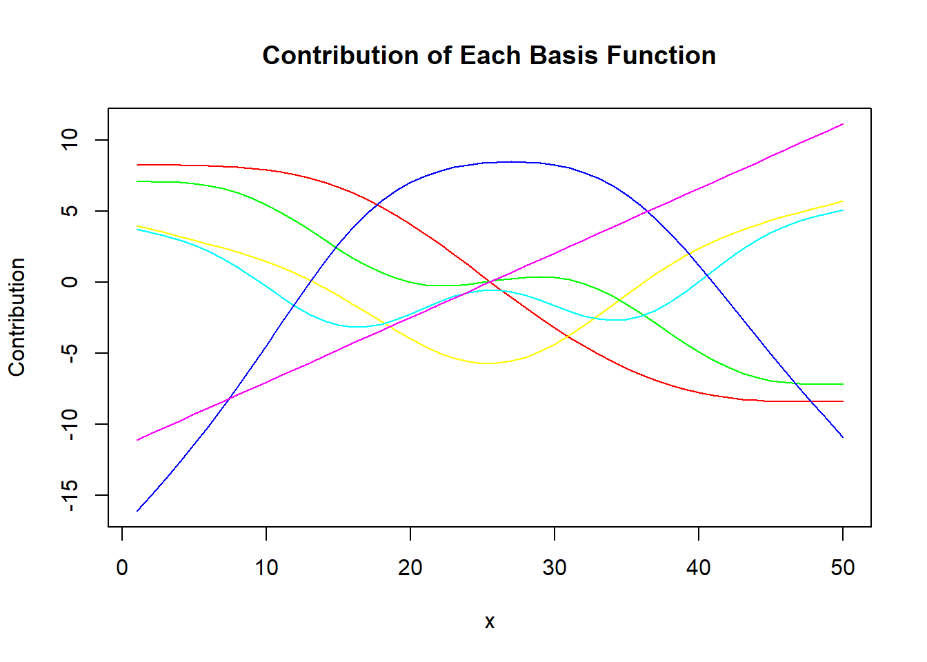 main = "Contribution of Each Basis Function", xlab = "x", ylab = "Contribution")