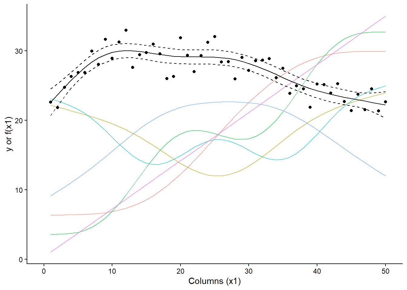 labs(x = "Columns (x1)", y = "y or f(x1)")+