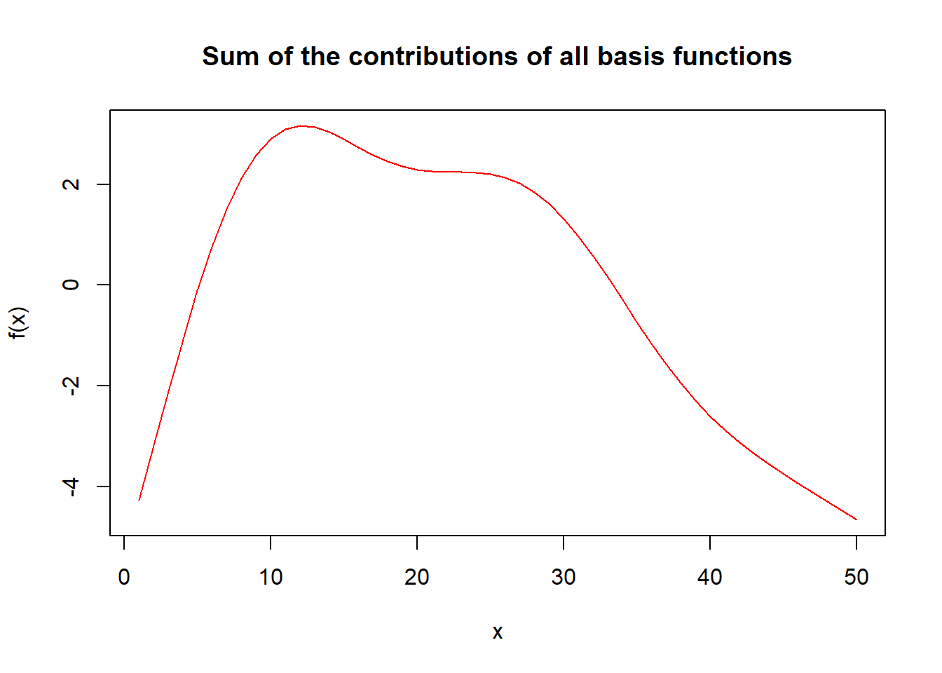 main = "Sum of the contributions of all basis functions", xlab = "x", ylab = "f(x)")